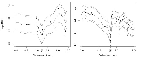 We use data from an ongoing cohort study of chronic kidney patients at Salford Royal NHS Foundation Trust, Greater Manchester, United Kingdom, to investigate the influence of acute kidney injury (AKI) on the subsequent rate of change of kidney function amongst patients already diagnosed with chronic kidney disease (CKD). We use a linear mixed effects modelling framework to enable estimation of both acute and chronic effects of AKI events on kidney function. We model the fixed effects by a piece-wise linear function with three change-points to capture the acute changes in kidney function that characterise an AKI event, and the random effects by the sum of three components - a random intercept, a stationary stochastic process with Matern correlation structure, and measurement error. We consider both multivariate Normal and multivariate t versions of the random effects. For either specification, we estimate model parameters by maximum likelihood and evaluate the plug-in predictive distributions of the random effects given the data. We find that following an AKI event the average long-term rate of decline in kidney function is almost doubled, regardless of the severity of the event. We also identify and present examples of individual patients whose kidney function trajectories diverge substantially from the population-average.